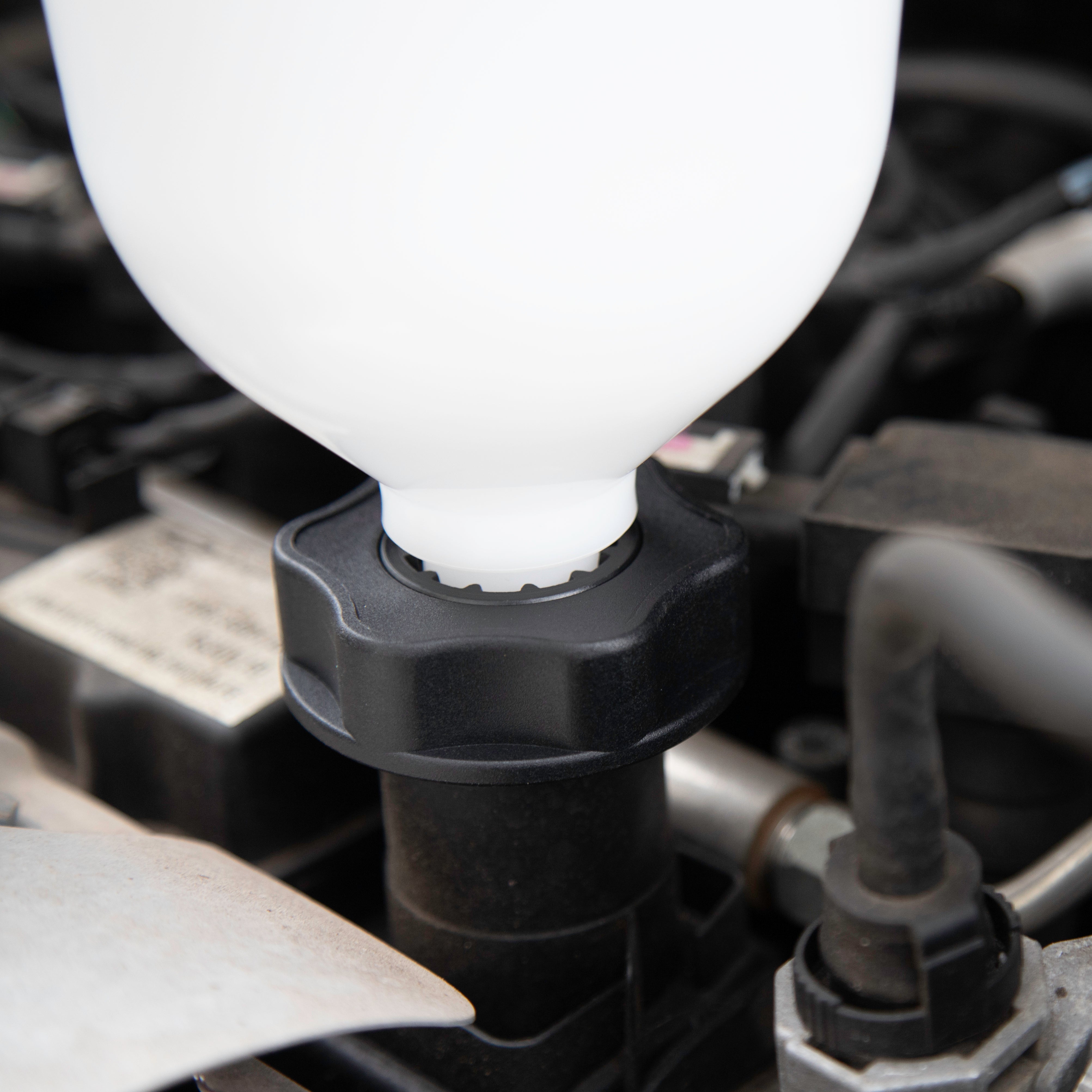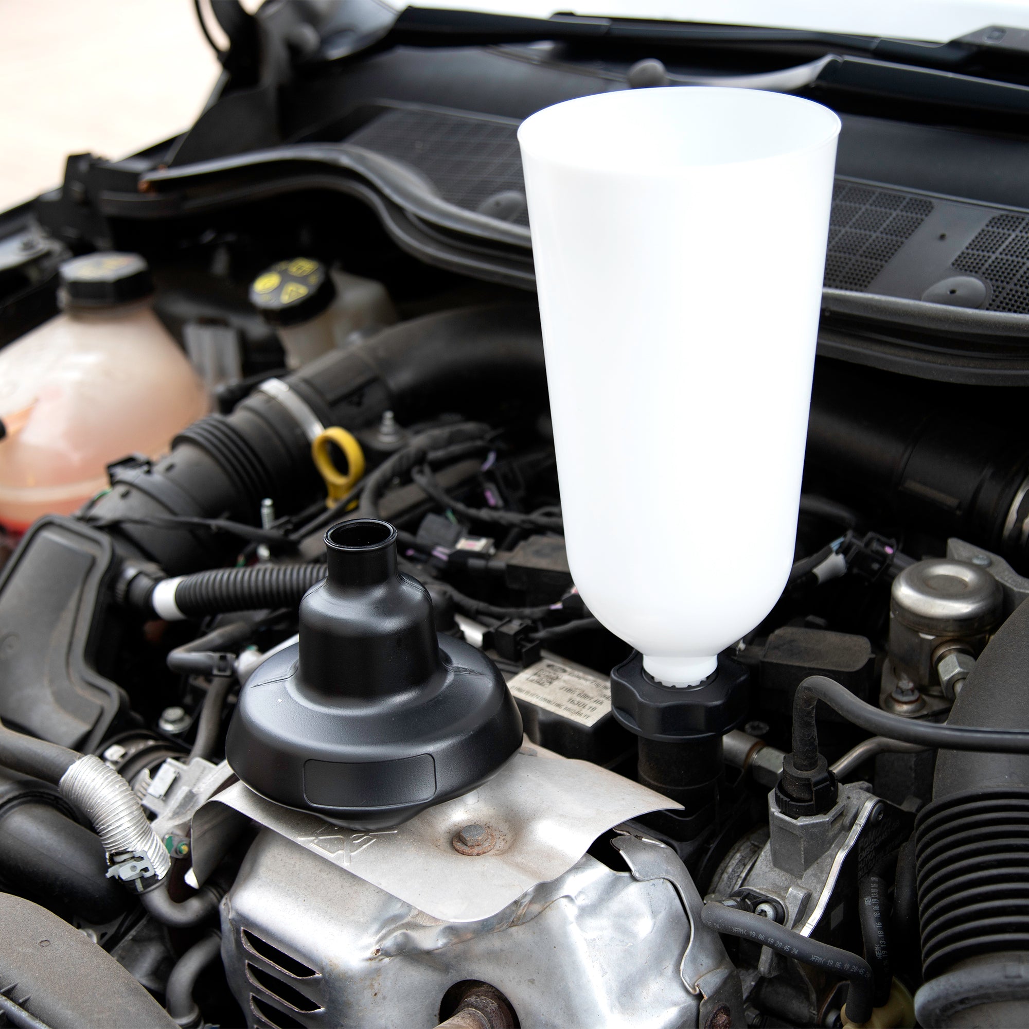 The funnel with the matching adaptor is mounted in place of the sealing cap on the oil filter valve, preventing unintended dripping of oil on to the cylinder head, cylinder block, intake manifold / exhaust manifold etc.